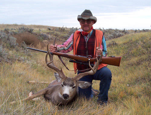 Allen Patz writes, "My father and I were out for a typical day of ranch work on the ranch. We had only been out for about two hours fixing fence and checking on cows. Nothing to exciting, except it was the middle of deer season and we had two tags to fill. As we drove across a large grease wood flat to check a herd of cows, we spotted this monster walking across to the resevoir on the other side. We were unsure of exactly how big he really was because he was a good distance off, but we had a plan.