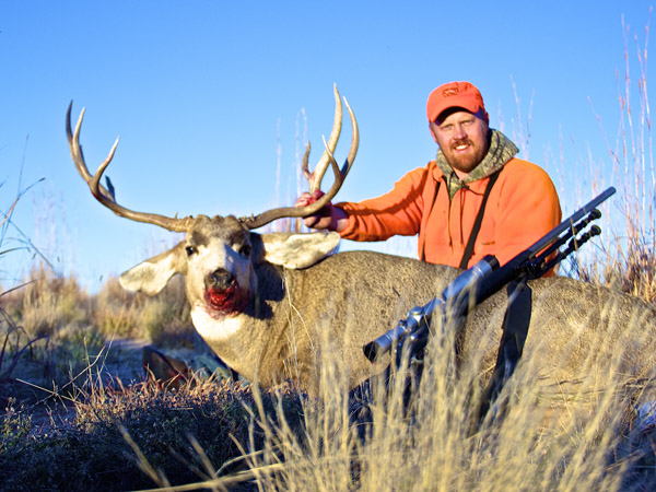 Josh Crippen writes, "I took this buck on October 28th, 2014 on a leftover deer tag on the plains of eastern Colorado. I spotted this buck the night before and could not gain permission to hunt. He was with 10 doe’s and was acting rutty. The next day I had to work and all I could think about was the big framed deer that we had seen the night prior. At the end of the day on the 28th, I talked to my wife and told her that I was going to go pick up a buddy of mine and see if we could locate the big buck. After about an hour of driving and picking up my friend, we were closing in on the area where I had seen the buck the night before. When we arrived at the field all we could find was the 10 doe’s from the night before and they were well within shooting distance from the road! My heart sank as I was sure that someone had taken the big buck that day while I was working. I told my friend that I might have an idea of where the deer may have gone if he was pressured, so we headed back to another property that I had permission to hunt. After arriving at the property we were once again having that sinking feeling as the big buck was nowhere to be seen. As I was glassing a big CRP field about a mile to the south, I could make out a buck standing in the middle of the field and my heart started to race. We put the spotting scope on him and realized that it was in fact a good buck, but could not tell how big. I told my friend, JD, that we had nothing to lose and we needed to make a play at him. We got into position to start our stalk and within 200 yards of the pickup I stopped and looked through my binoculars and could see the buck laying with his head flat on the ground staring a hole straight through us. JD suggested that we back out and try another approach, but myself being hard headed told him, "let’s just go straight at him we have nothing to lose and are already well within the effective range of my 7mm RUM". As we approached where the buck was bedded we could not find him in the nearly 6' tall CRP grass and it was just at that instant he stood up and was making tracks to get out of the country. My first shot landed somewhere in the next county I’m sure, but my second shot was true and anchored the buck for good. After a lot of whooping and hollering we stood there in shock looking at the biggest buck that I have ever taken. He is right at 32" outside with a rough gross score of 186. I am still presently on cloud 9."