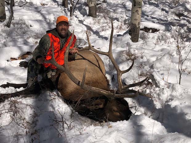 "I was able to fill my tag with this elk on the fourth day of the hunt after passing on several other smaller bulls. This bull was 1 of 3 pretty good bulls in a group of about 150 that we had seen the first night of the season but weren’t able to get a shot at any of them.